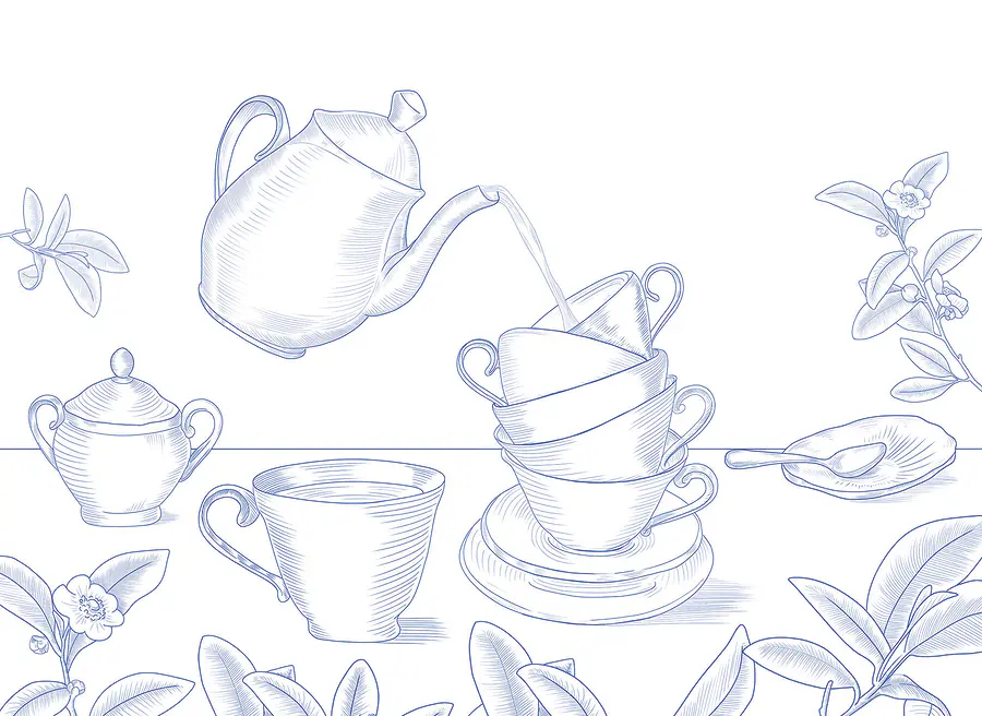 Ταπετσαρίες Τσαγιέρα που χύνει σε μια στοίβα από φλιτζάνια τσαγιού