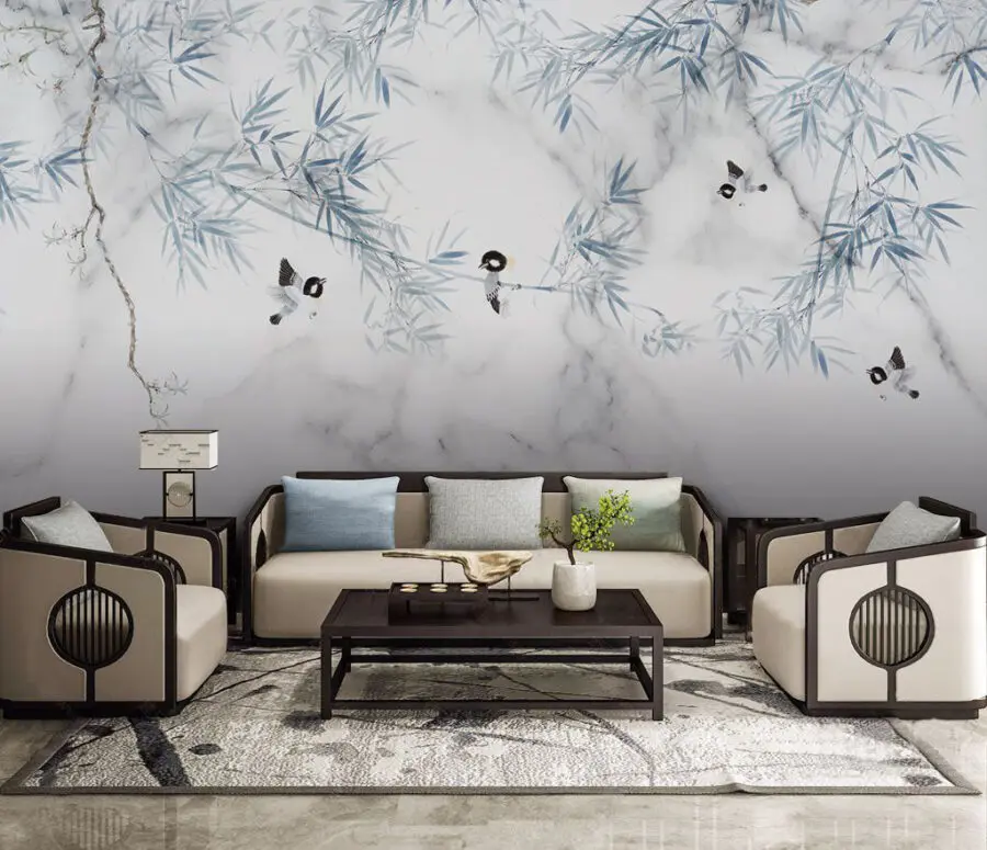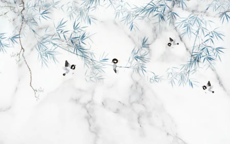 Ταπετσαρίες Λευκή μαρμάρινη επιφάνεια με μπλε φύλλα και πουλιά