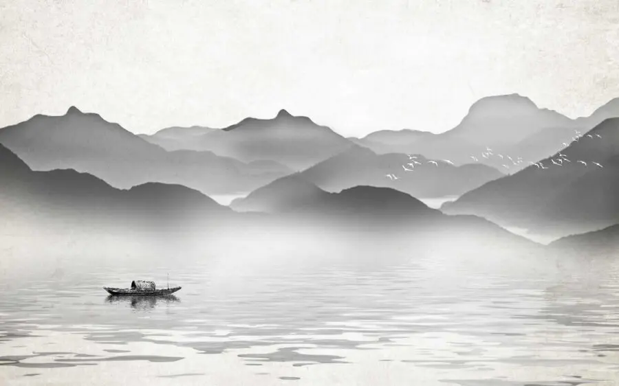 Ταπετσαρίες Σκάφος στο νερό με βουνά στο φόντο