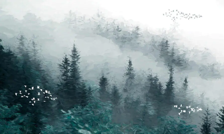 Ταπετσαρίες Ομιχλώδες δάσος με πουλιά που πετούν
