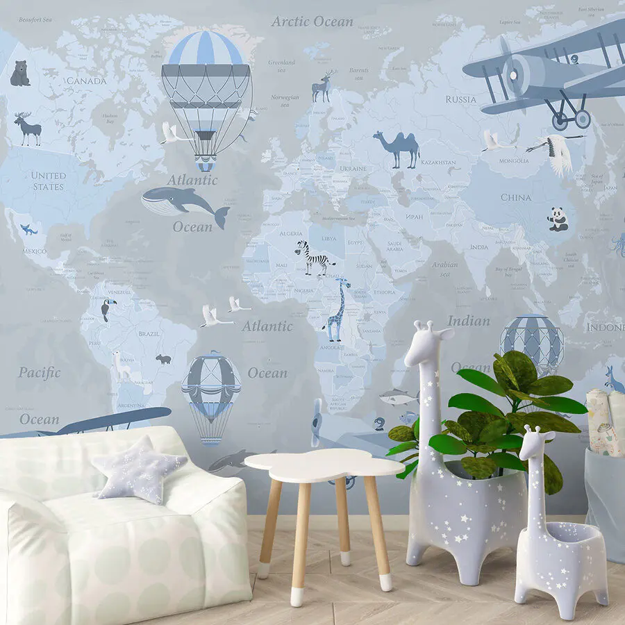 Ταπετσαρίες Χάρτης του κόσμου με διαφορετικούς τύπους αεροπλάνων και ζώων