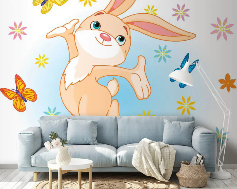 Ταπετσαρίες Γελοιογραφία ενός κουνελιού που πηδάει στον αέρα με πεταλούδες