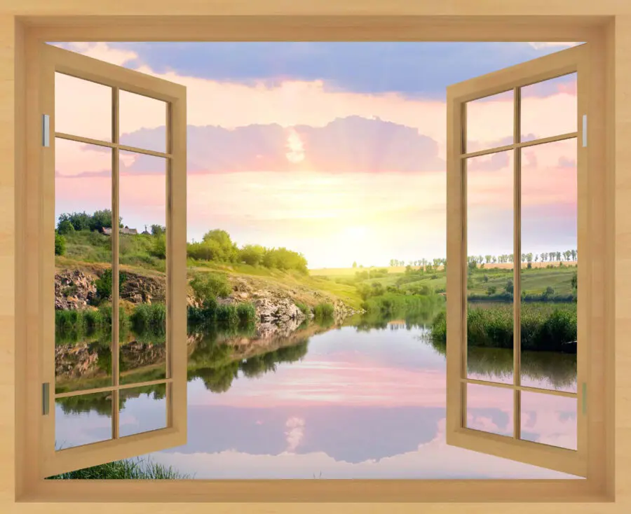 Ταπετσαρίες Παράθυρο με θέα σε ποτάμι και χορταριασμένο λόφο