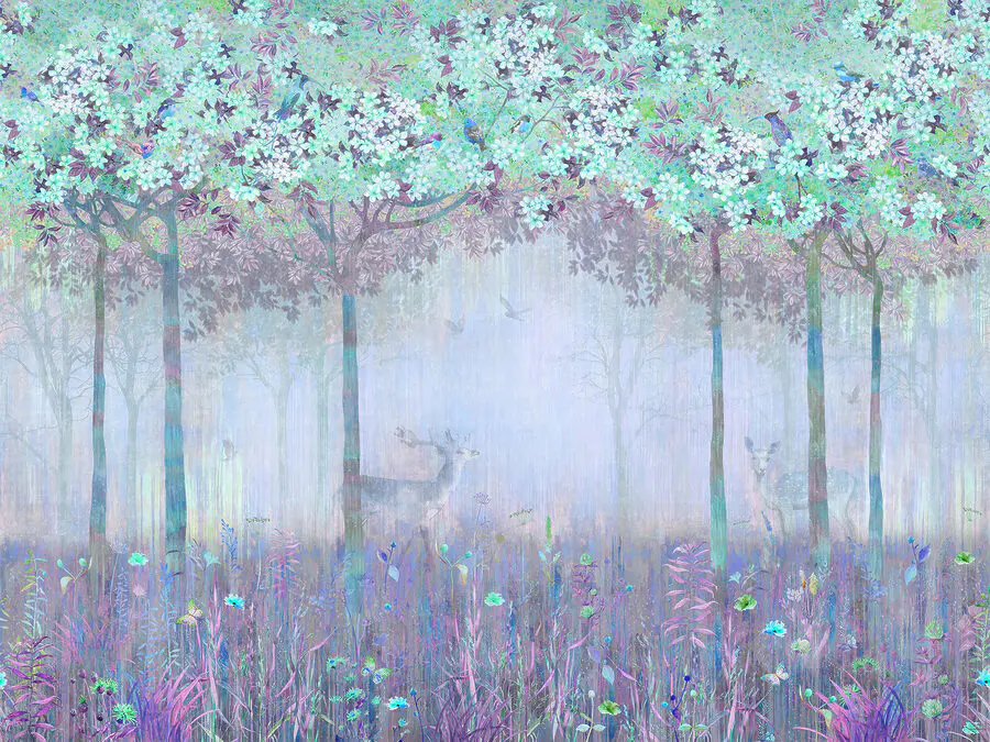 Ταπετσαρίες Μια ζωγραφιά ενός δάσους με δέντρα και λουλούδια