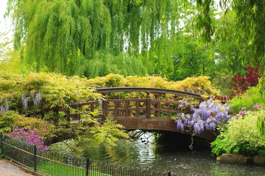 Ταπετσαρίες Γέφυρα πάνω από το νερό με δέντρα και φυτά