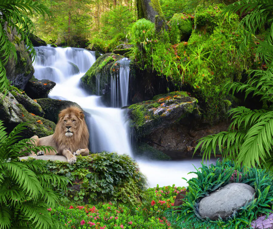 Ταπετσαρίες Λιοντάρι ξαπλωμένο σε βράχο δίπλα σε καταρράκτη