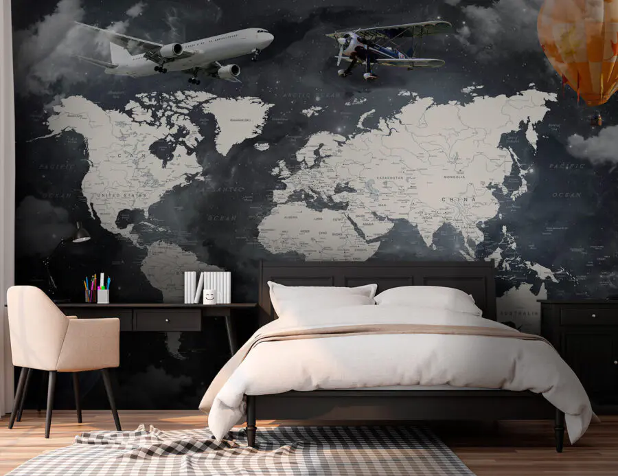 Ταπετσαρίες Χάρτης του κόσμου με αεροπλάνα και αερόστατα θερμού αέρα