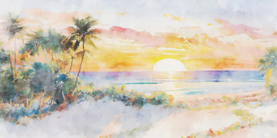 Ταπετσαρίες Ακουαρέλα ζωγραφικής μιας παραλίας με φοίνικες και ηλιοβασίλεμα
