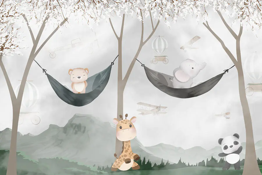Φανταστείτε αυτό: ένας κόσμος όπου μια καμηλοπάρδαλη και μια αρκούδα χαλαρώνουν σε αιώρες, κρεμασμένες από δέντρα, με ομιχλώδη βουνά και vintage αερόπλοια να αιωρούνται στο φόντο. Αυτή η ιδιόρρυθμη τοιχογραφία κάνει τα παιδικά δωμάτια ένα ονειρικό μέρος, σαν να μπαίνετε σε μια περιπέτεια παραμυθιού όπου τα ζωάκια παίρνουν χαλαρούς ύπνους. Ιδανική για παιδικά δωμάτια ή παιδότοπους, είναι σαν μια απαλή αγκαλιά για τους τοίχους. Οι απαλές αποχρώσεις και οι γοητευτικοί χαρακτήρες είναι βέβαιο ότι θα προκαλέσουν χαμόγελα και παραμύθια για περιπετειώδη σαφάρι και ζεστές φιλίες στο δάσος. Σοβαρά, σε ποιον δεν θα άρεσε μια αρκούδα και ένας ελέφαντας να αράζουν πάνω από το κεφάλι σας; Είναι παιχνιδιάρικο, ηρεμιστικό και απόλυτα απολαυστικό - φανταστείτε τα γλυκά όνειρα που γεννιούνται από μια τέτοια μαγική σκηνή!