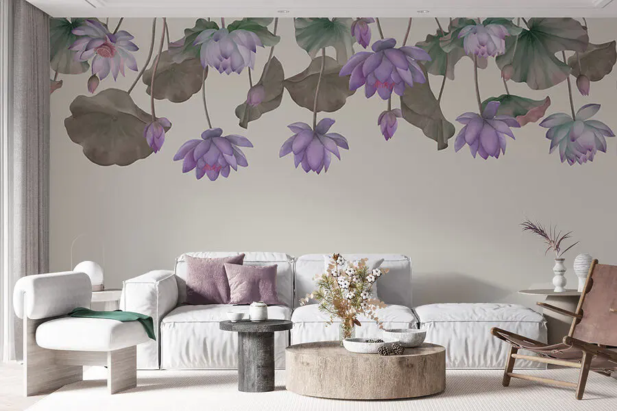 Ταπετσαρίες Σειρά από μοβ λουλούδια και πράσινα φύλλα