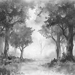 Ταπετσαρίες Ένα ομιχλώδες δάσος με δέντρα και θάμνους