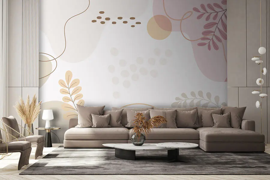 Ταπετσαρίες Λευκό φόντο με ροζ και πορτοκαλί φύλλα και κύκλους