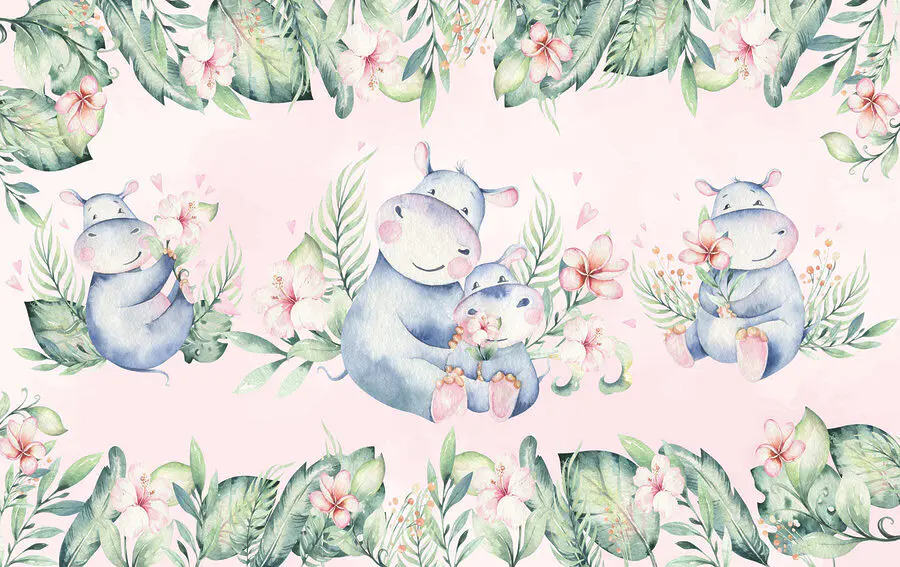 Ταπετσαρίες Απρόσκοπτο μοτίβο από ιπποπόταμους και λουλούδια ακουαρέλας