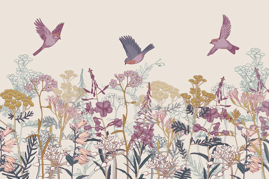 Ταπετσαρίες Πουλιά που πετούν πάνω από λουλούδια