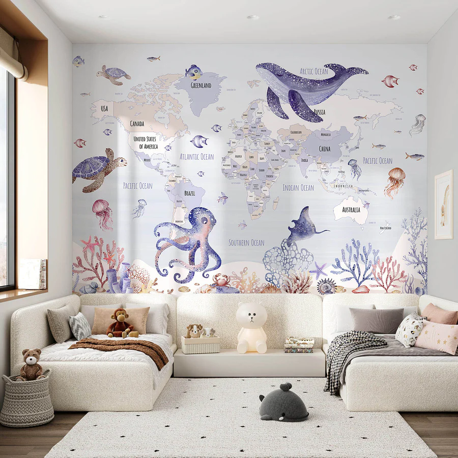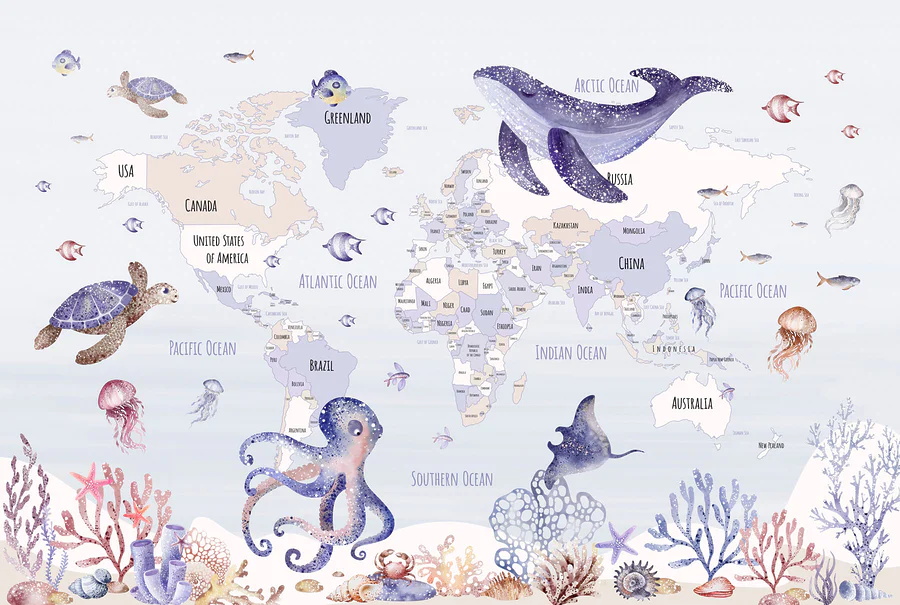 Μεταμορφώστε το παιδικό δωμάτιο ή το χώρο παιχνιδιού με αυτή τη γοητευτική τοιχογραφία του παγκόσμιου χάρτη, με μια απολαυστική συλλογή από θαλάσσια πλάσματα. Φανταστείτε ένα ζωντανό χταπόδι να χαιρετάει, χελώνες να γλιστρούν και μια ευγενική φάλαινα να κολυμπάει πάνω από το κεφάλι σας - ιδανικό για να εξάψει τη φαντασία σας. Αυτή η τοιχογραφία δεν διδάσκει απλώς γεωγραφία, αλλά δημιουργεί μια μαγική υποβρύχια περιπέτεια ακριβώς στον τοίχο. Τα παιδιά μπορούν να εξερευνήσουν τους ωκεανούς, να ανακαλύψουν ηπείρους, ακόμα και να ονειρευτούν μακρινά μέρη - όλα αυτά από την άνεση του δωματίου τους. Είναι σαν μια πρόσκληση για να διασχίσουν τους ωκεανούς και να βουτήξουν βαθιά χωρίς να φύγουν ποτέ από το σπίτι. Ποιος δεν θα το ήθελε αυτό; Ιδανικό για μικρούς τυχοδιώκτες και ονειροπόλους!