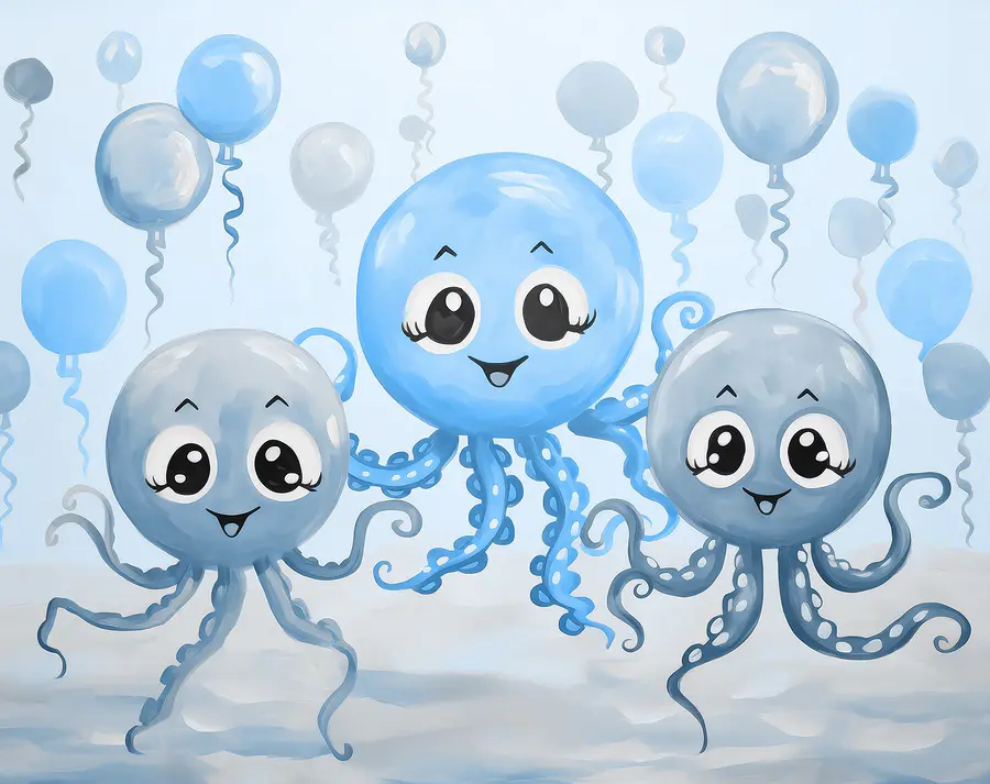 Βυθιστείτε σε μια θάλασσα διασκέδασης με αυτή την ιδιόμορφη τοιχογραφία τοίχου με μια παιχνιδιάρικη ομάδα χταποδιών, που επιπλέουν χαρούμενα με τα μπαλόνια τους. Φανταστείτε τα χαμόγελα που θα σας χαρίσει - είναι σαν ένα χαρούμενο υποβρύχιο πάρτι που θα εκτοξευτεί στον τοίχο σας! Ιδανική για παιδικά δωμάτια ή για οποιονδήποτε χώρο που χρειάζεται μια δόση ιδιοτροπίας. Τα απαλά μπλε χρώματα και τα φιλικά πρόσωπα δημιουργούν μια ηρεμιστική ατμόσφαιρα, καθιστώντας το ένα εξαιρετικό σκηνικό για ιστορίες πριν τον ύπνο ή περιπέτειες κατά τη διάρκεια του παιχνιδιού. Είναι δύσκολο να μην χαμογελάσετε σε αυτά τα χαριτωμένα, σωστά; Μεταμορφώστε οποιοδήποτε δωμάτιο σε μια χαρούμενη υποβρύχια απόδραση και αφήστε αυτά τα οκταμελή φιλαράκια να σας κρατήσουν συντροφιά!
