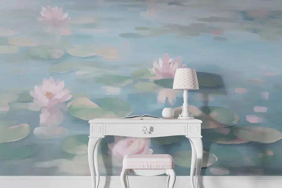 Μεταμορφώστε οποιονδήποτε χώρο με αυτή τη μαγευτική τοιχογραφία με γαλήνιο νερό, λεπτεπίλεπτα κρινάκια και απαλά ροζ λουλούδια. Φανταστείτε να μπαίνετε σε μια ήρεμη όαση ακριβώς στο σπίτι σας - ακούγεται ονειρικό, έτσι δεν είναι; Οι απαλές αποχρώσεις δημιουργούν μια ηρεμιστική ατμόσφαιρα, ιδανική για το καθιστικό, το υπνοδωμάτιο ή ακόμη και για μια ζεστή γωνιά ανάγνωσης. Και ποιος δεν θα μπορούσε να χρησιμοποιήσει λίγη περισσότερη φύση στους εσωτερικούς χώρους; Οι φίλοι μπορεί ακόμη και να πιάσουν τον εαυτό τους να το κοιτάζει, να βρεθούν χαμένοι στις σκέψεις τους, ονειροπολώντας για τις καλοκαιρινές μέρες δίπλα στη λίμνη. Αυτή η τοιχογραφία δεν είναι απλώς διακόσμηση, είναι μια εμπειρία! Προσθέστε μια πινελιά ιδιοτροπίας και χαλάρωσης στους τοίχους σας - είναι σαν να προσκαλείτε ένα κομμάτι της φύσης στο εσωτερικό σας.