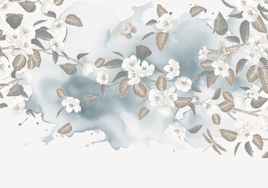 Ταπετσαρίες Λευκά λουλούδια και φύλλα σε μπλε φόντο